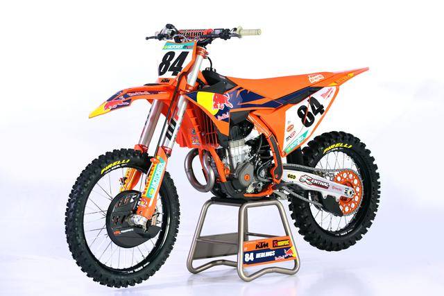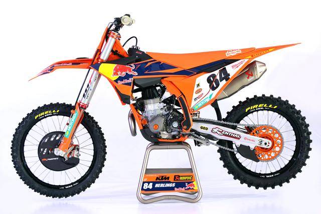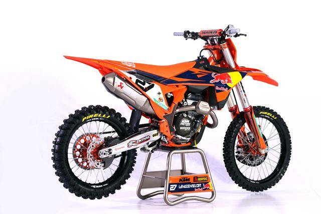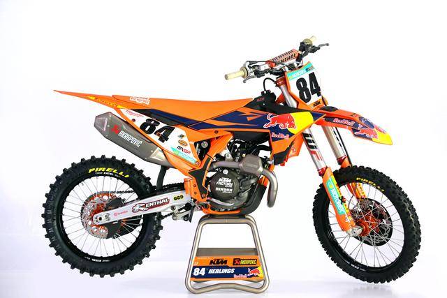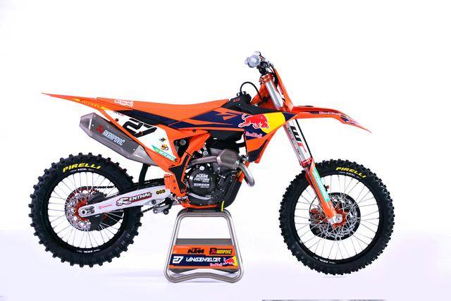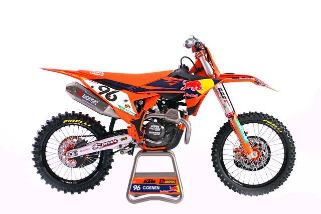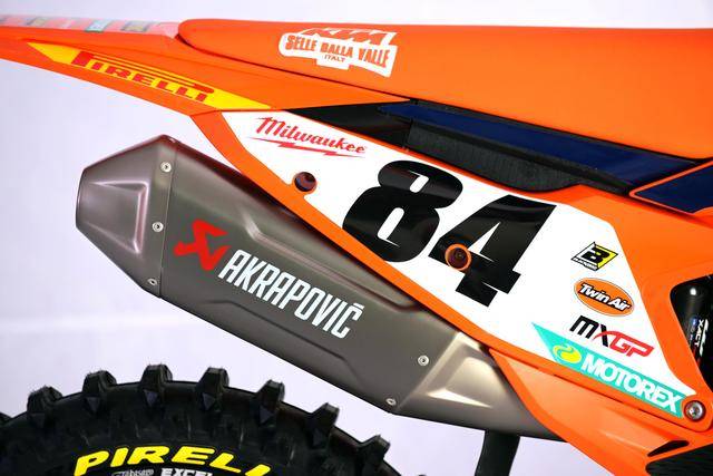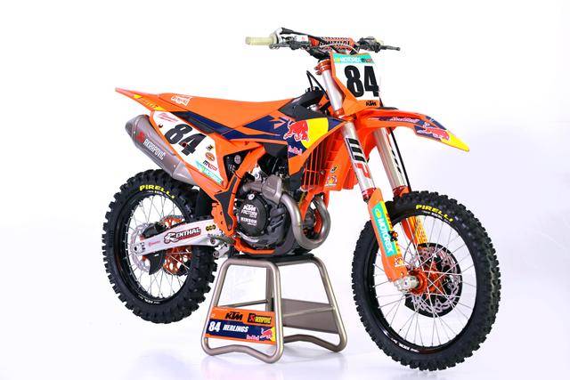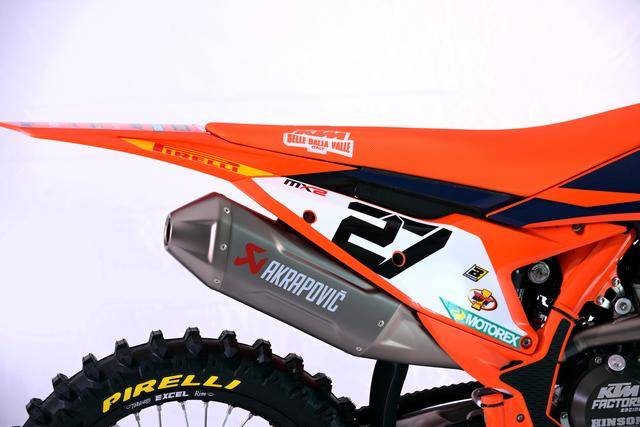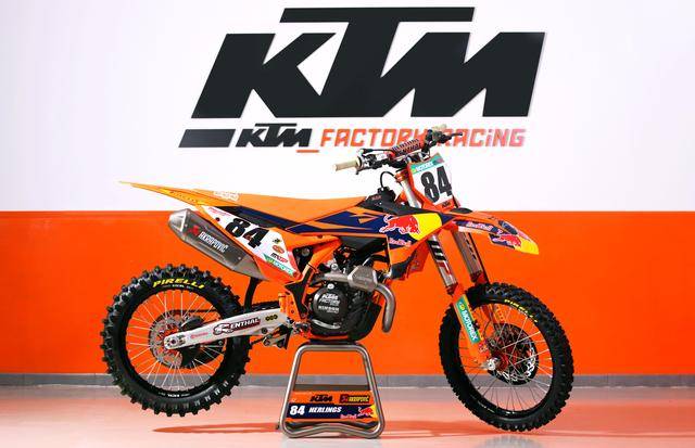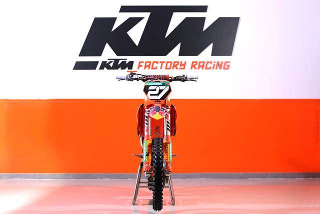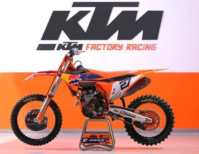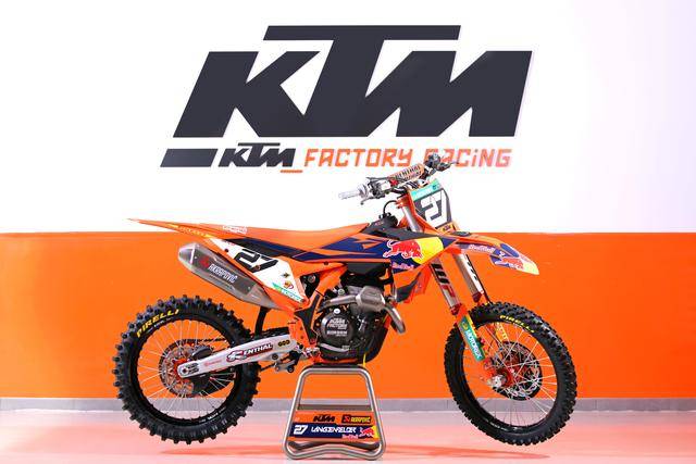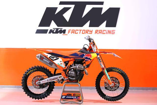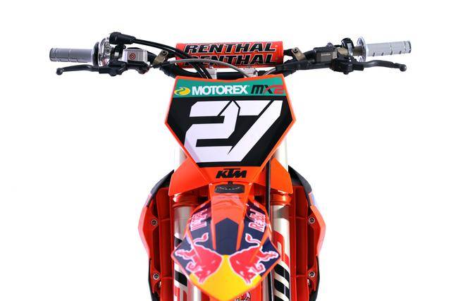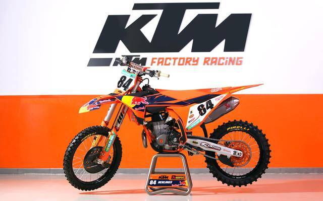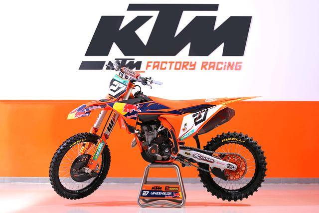 在 MXGP 級(jí)別,KTM 工廠車隊(duì)的車手組合駕駛 84 號(hào)車的荷蘭車手賀靈斯(Jeffrey Herlings),和駕駛 96 號(hào)車的比利時(shí)車手 L. 科寧(Lucas Coenen)。KTM 在這一級(jí)別使用的工廠賽車是 450 SX-F,該車搭載一副水冷四沖程單氣缸、SOHC 四氣閥發(fā)動(dòng)機(jī),缸徑、行程為 95 mm x 63.4 mm ,排氣量 449.9 cc,市售標(biāo)準(zhǔn)版的最大動(dòng)力輸出超過 63 匹(非 KTM 官方正式數(shù)字),而經(jīng)過特別改造的工廠賽車版、預(yù)計(jì)峰值馬力輸出將超過 70 匹。