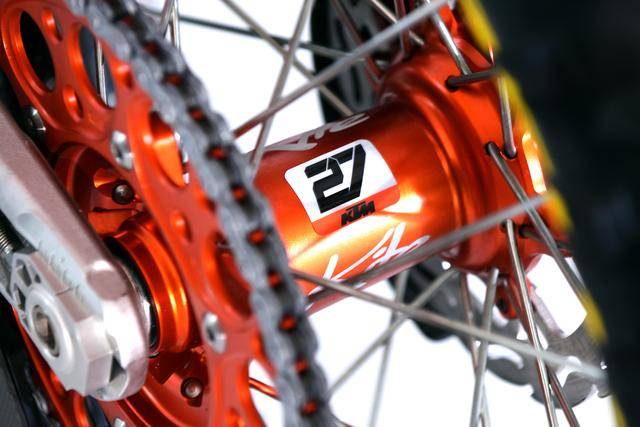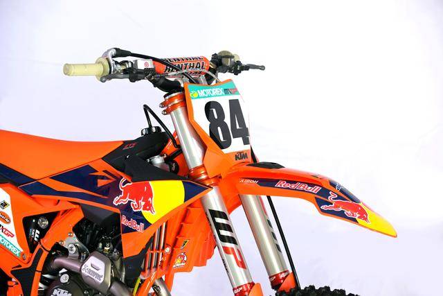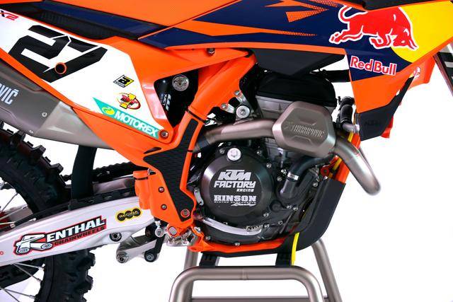 KTM 在 MX2 級(jí)別的工廠賽車是 250 SX-F。該車搭載一副水冷四沖程單氣缸、DOHC四氣閥的發(fā)動(dòng)機(jī),缸徑、行程為 81 mm x 48.5 mm ,排氣量 249.9 cc,廠方同樣沒有公布最大動(dòng)力輸出,參考外媒的報(bào)道,市售標(biāo)準(zhǔn)狀態(tài)下的 250 SX-F、最大動(dòng)力輸出超過 47 匹(非 KTM 官方正式數(shù)字),工廠賽車規(guī)格的 250 SX-F 預(yù)計(jì)會(huì)超過 55 匹。