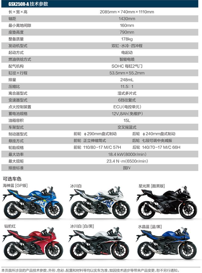 國四版GSX250R和國四版DL250在涂裝上都進行了重新設(shè)計,相信新花色能夠助力這兩款國民車款更受歡迎。國四版的GW250系列首次增加了雙通道ABS,同時從參數(shù)表看動力數(shù)據(jù)有小幅增加,整備質(zhì)量達到187kg,涂裝也進行了重新設(shè)計,相信增加了ABS的國四版GW250系列又能讓這款摩界常青樹再火幾年。