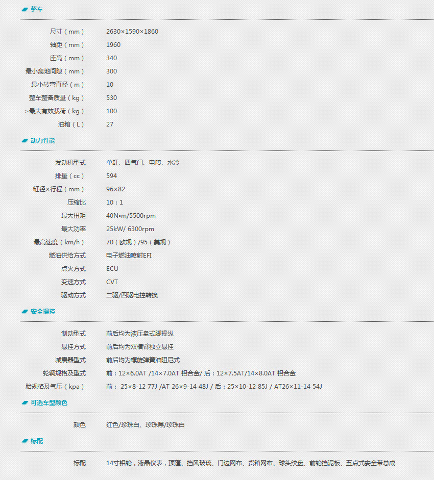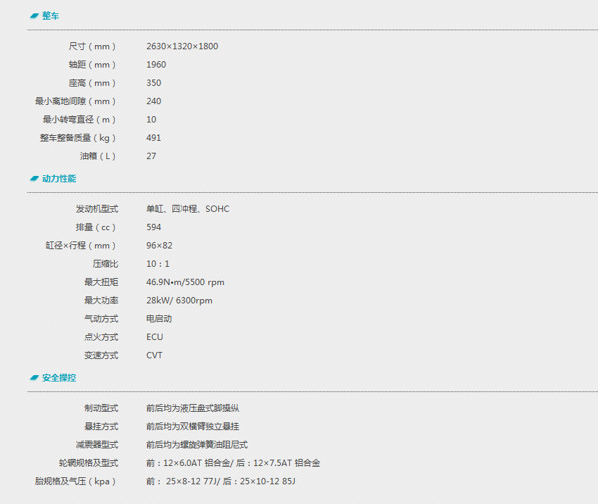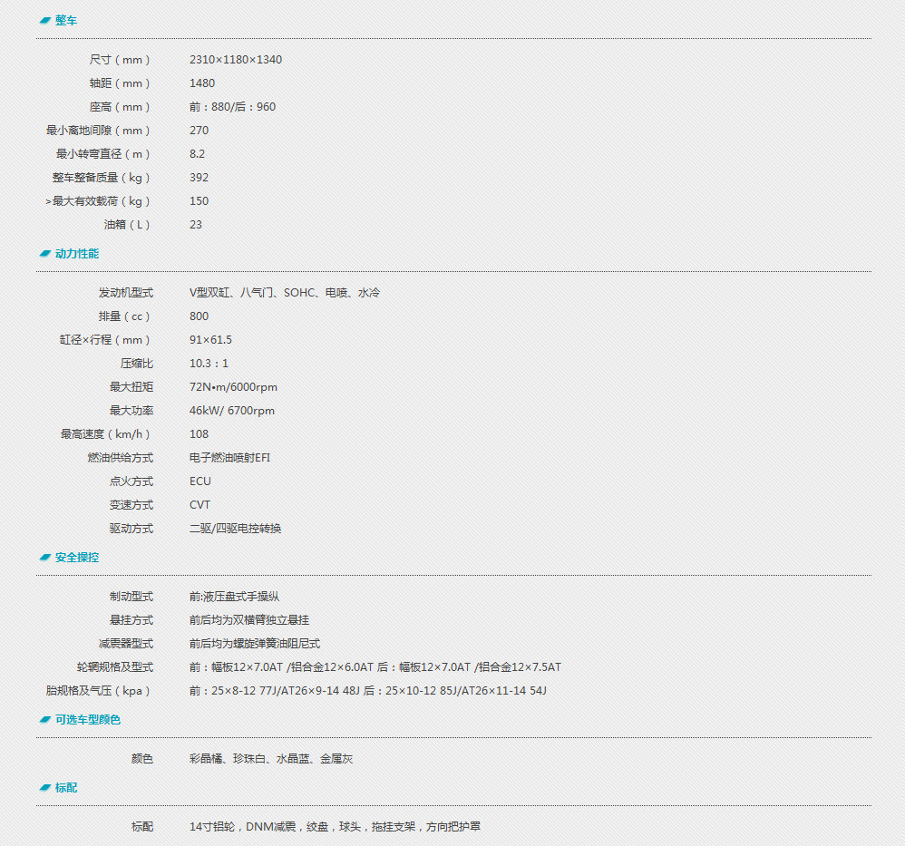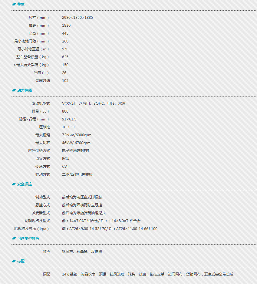 800cc、V型双~、八气门、单置凸轮轴、电(sh)h冷发动机Q功率达?6kWQ动力强Ԍ性能卓越?/p>