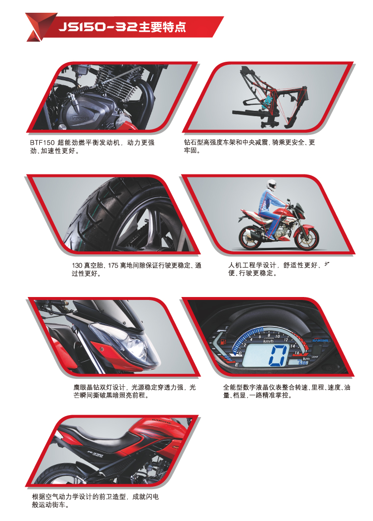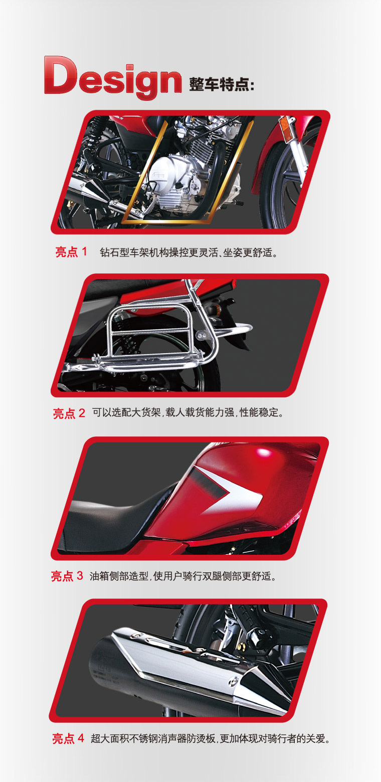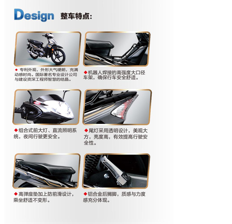 整R特点Q专利外观,外Ş大气朗Q充满动感时。国际著名专业设计公怸资深工程师智慧的l晶。机器h焊接的高强度大口径RӞ保行R安全舒适。组合前大灯、直照明系l,夜间行驶更安全。尾灯采用透明设计Q美观大方,亮度高,有效提高行驶安全性。高弹垫加上防前滑设计Q乘坐舒适不变Ş。铝合金后搁脚,质感与力度感充分体现?/div>