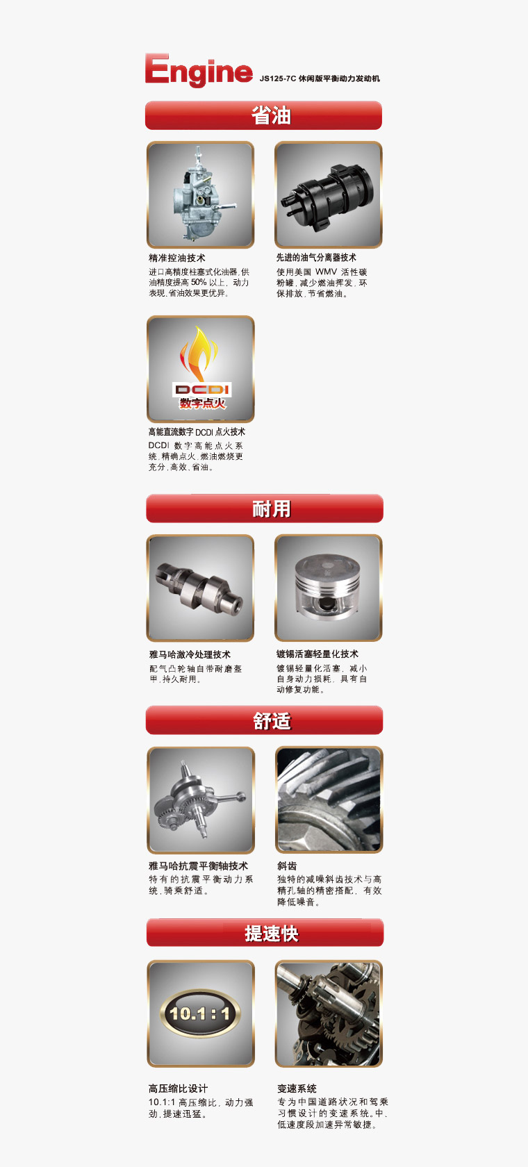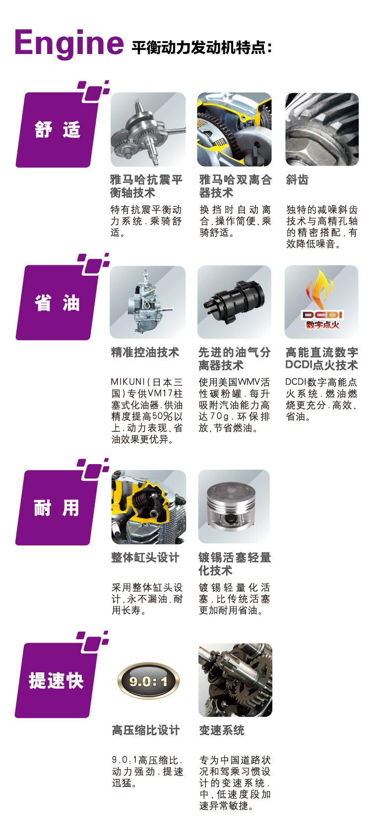 舒?--雅马哈抗震^衡u技术,Ҏ(gu)抗震q动力pȝQ乘骑舒适。雅马哈双离合器技术,换挡q稳Q操作简ѝ乘骑舒适。斜齿,独特的减噪斜齿技术与高精孔u的精密搭配,有效降低噪音?/p>