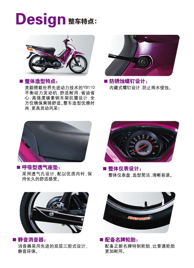 整R设计特点Q灵颖搭载世界先q动力技术的YB110q动力发动机,舒适耐用Q省油省?j),高强度碳素钢车架抗震设计Q全方位保乘骑舒适。整车造型优雅时尚Q更L(fng)动风采。防锈蚀螺钉设计Q内藏式螺钉设计Q防止雨水R蚀。呼吸型透气座垫Q采用透气孔设计,配以优质内衬Q保持长久的舒适感受。整车A表设计,整体仪表盘,造型z,清晰易读。静(rn)x韛_Q消韛_采用先进的双层三腔式设计Q静(rn)音环保。配备名牌轮胎,配备名牌特质轮胎Q比普通轮胎更加耐用?/p>