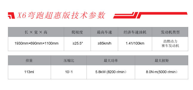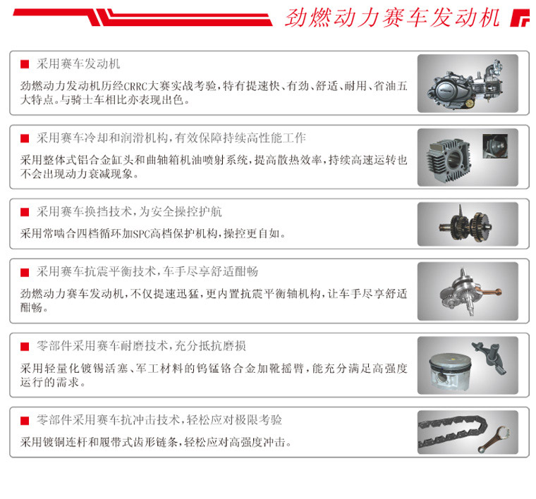 采用赛R发动机:(x)劲燃动力发动机历lCRRC大赛实战考验Q特有提速快、有劌Ӏ舒适、耐用、省油五大特炏V与骑士车相比亦表现?br />