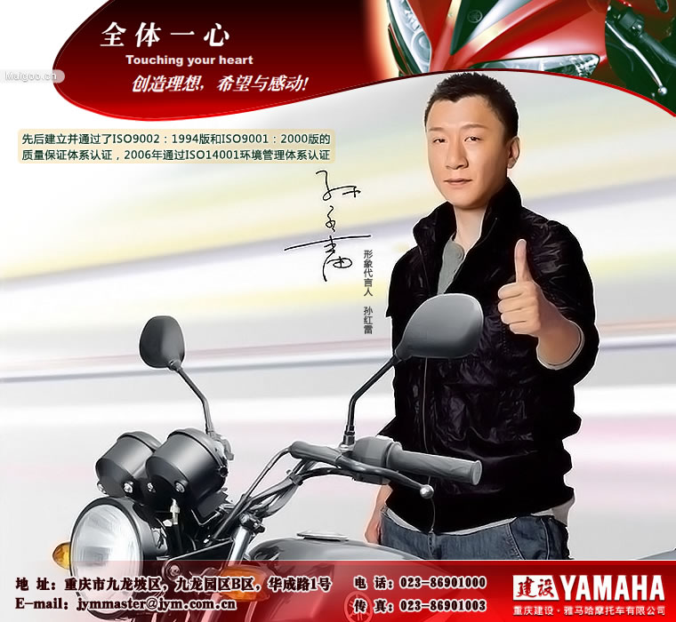 2004年 上海雅馬哈建設(shè)摩托車(chē)銷(xiāo)售有限公司成立,負(fù)責(zé)包括JYM在內(nèi)的中國(guó)地區(qū)雅馬哈摩托車(chē)銷(xiāo)售及售后服務(wù)、零配件銷(xiāo)售等業(yè)務(wù)。