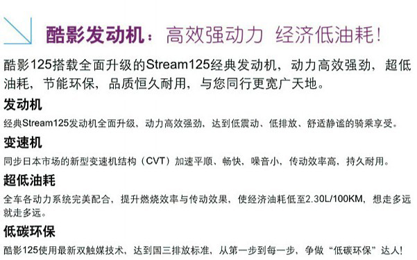 酷影發(fā)動機,高效強動力,經(jīng)濟低油耗??嵊?25搭載全面升級的Stream125經(jīng)典發(fā)動機,動力高效強勁,超低油耗,節(jié)能環(huán)保,品質(zhì)恒久耐用,與您同行更寬廣天地。發(fā)動機:經(jīng)典Stream125發(fā)動機全面升級。動力高效強勁,達到低震動、低排放、舒適靜謐的騎乘享受。變速機:同步日本市場的新型變速機結(jié)構(gòu)(CVT)加速平順、暢快,噪音小,傳動效率高,持久耐用。超低油耗:全車各動力系統(tǒng)完美配合,提升燃燒效率與傳動效果,使經(jīng)濟油耗低至2.10L/100KM,想走多遠(yuǎn)就走多遠(yuǎn)。低碳環(huán)保:酷影125使用最新雙觸媒技術(shù),達到國三排放標(biāo)準(zhǔn),從第一部到每一步,爭做“低碳環(huán)保”達人!