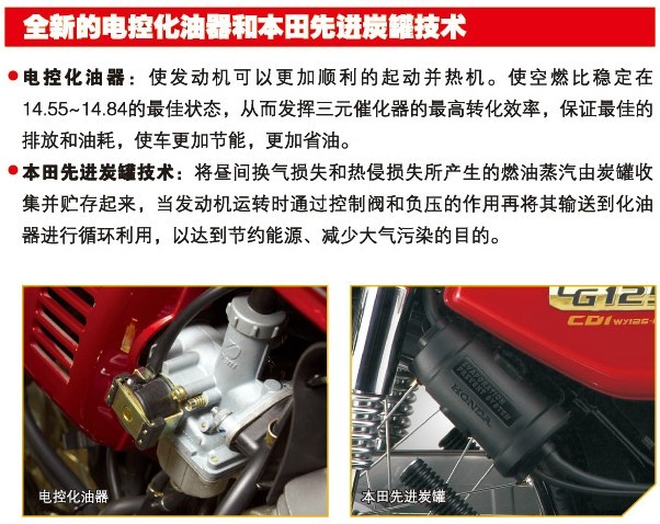 電控化油器:使發(fā)動機可以更加順利的啟動并熱機。使空燃比穩(wěn)定在14.55-14.84的最佳狀態(tài),從而發(fā)揮三元催化器的高轉(zhuǎn)化效率,保證最佳的排放和油耗,使車更加節(jié)能,更加省油。