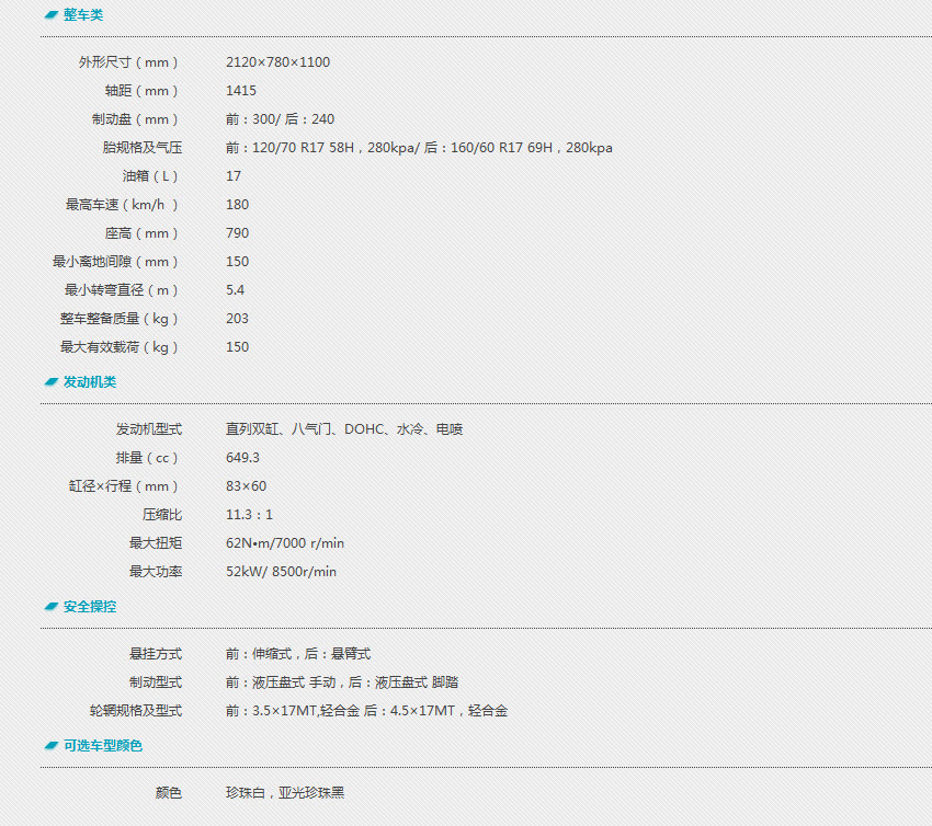 發(fā)動機型式直列雙缸、八氣門、DOHC、水冷電噴