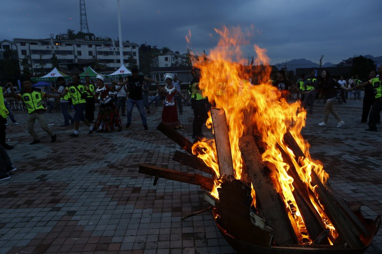 晚會環(huán)節(jié)開始,苗族美女登場,首先是民族特色舞蹈,舞蹈演員到臺下來和車迷們跳起竹竿舞。