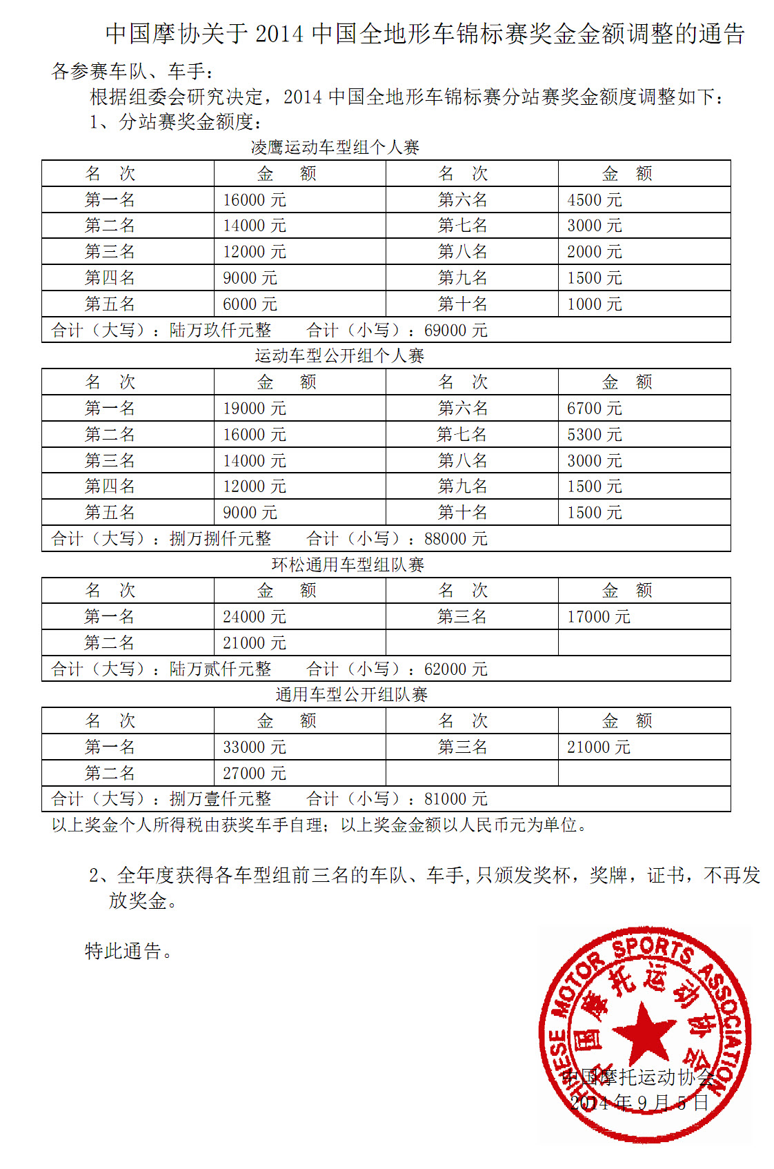 關(guān)于2014中國全地形車錦標(biāo)賽比賽獎金調(diào)整的通告