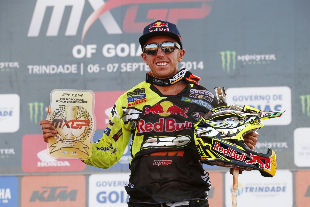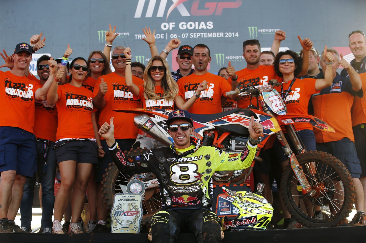 9月7號舉行的2014' 世界越野錦標(biāo)賽(MXGP)巴西站,眼角帶傷出賽的凱羅尼(Antonio Cairoli)分別奪得了第五名(第一節(jié)比賽)、第三名(第二節(jié)比賽),在年度積分榜上大幅領(lǐng)先排在第二位的比利時車手 Jeremy van Horebeek,提前兩站(9月14號的墨西哥站、9月28號的拉脫維亞站)奪得了今年的世界冠軍。這是凱羅尼連續(xù)第六年(2009 至 2014)奪得本項(xiàng)比賽的冠軍。