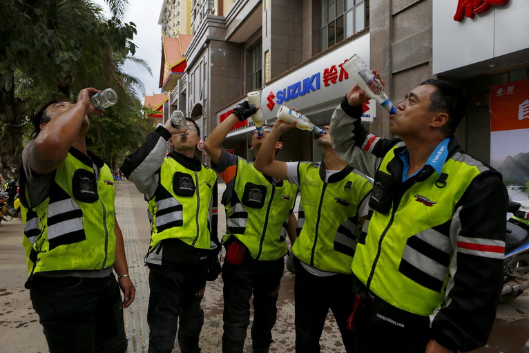 在版納的豪爵店前,隊(duì)員們以冰凍的啤酒代替香檳,慶祝勝利到達(dá)終點(diǎn)!