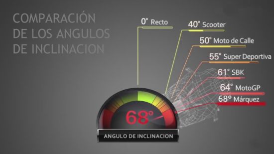 從上面這張圖我們可以看出,一般速可達的極限傾角約為40度,街車50度,超級跑車55度,SBK用車61度,MotoGp賽車為64度。神奇的馬奎斯居然做到了68度,讓人嘆為觀止。我個人認為如果羅西、佩特羅薩、洛倫佐被譽為外星人,那么天才馬奎斯就應該是超人-SuperMan!