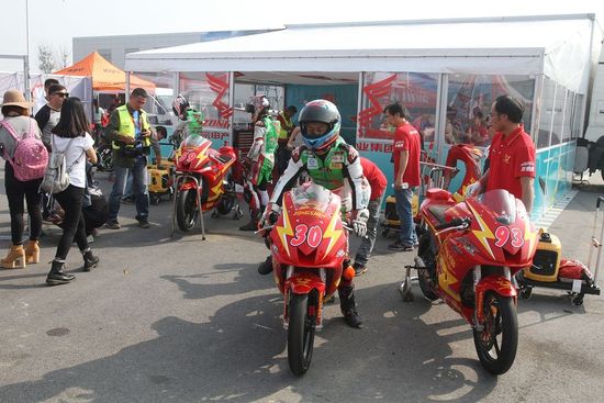 本站比賽,面對競爭對手咄咄逼人的態(tài)勢,中國宗申車隊仍然按照自己爭奪年度團體總冠軍和測試升級賽車的目標繼續(xù)推進。由于中國宗申車隊在來北京前,已連續(xù)在歐洲征戰(zhàn)電動摩托車錦標賽一個月之多,車隊沒有時間來升級和測試賽車,這站比賽,車隊正好也可以借機來測試一下部分升級零件。因為按照此前的積分,中國宗申車隊已領(lǐng)先對手45分了,本站比賽最多再拿29分就可以了,對于兩回合兩名車手來拿這點分數(shù),憑借車隊的實力和RC250R來說,這都不是事。昨天的練習(xí)賽和排位賽中,車隊測試了凸輪軸和氣門,時間緊迫,尚未能徹底完成相關(guān)工作,昨天晚上,車隊又加班進行了整改。今天的比賽,正好可以檢驗昨晚的整改工作。