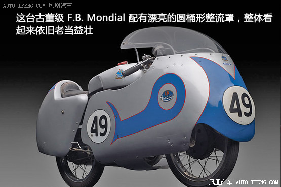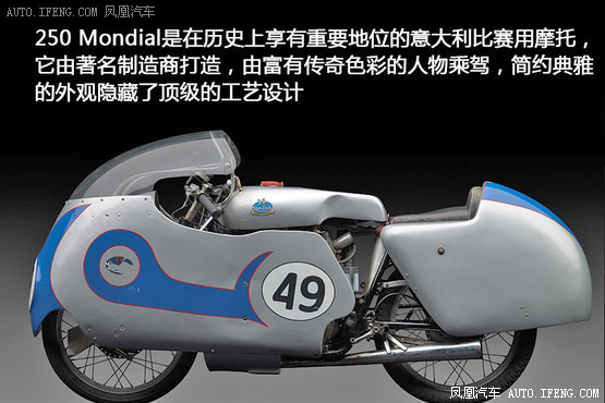 250 Mondial是在歷史上享有重要地位的意大利比賽用摩托,它由著名制造商打造,由富有傳奇色彩的人物乘駕,簡(jiǎn)約典雅的外觀隱藏了頂級(jí)的工藝設(shè)計(jì)。它美麗、富有競(jìng)爭(zhēng)精神、血統(tǒng)純正,摩托的外表承載著如煙往事,因此,此次出售這款古董級(jí)250 F.B. Mondial摩托實(shí)屬難得。