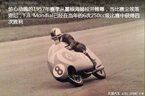 驚心動(dòng)魄的1957年賽季從霍根海姆拉開(kāi)帷幕,當(dāng)比賽塵埃落定后,F(xiàn).B. Mondial已經(jīng)在當(dāng)年的6次250cc級(jí)比賽中獲得四次勝利,其中兩次都是由Cecil Sandford駕駛操控。在經(jīng)過(guò)歐洲大陸殘酷的比拼較量后,Sandford已經(jīng)衛(wèi)冕25cc級(jí)世界冠軍,他的隊(duì)友Provini 和Miller緊隨其后。值得一提的的是,Provini絕對(duì)堪稱125cc級(jí)比賽之王,他取得三次勝利并擁有自己的世界冠軍稱號(hào)。