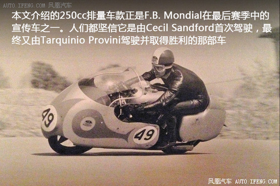 而本文介紹的250cc排量車款正是F.B. Mondial在最后賽季中的宣傳車之一。人們都堅(jiān)信它是由Cecil Sandford首次駕駛,最終又由Tarquinio Provini駕駛并取得勝利的那部車。