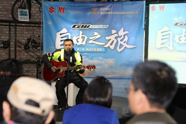 喧鬧之中,歌手上臺吉他彈唱《公路之歌》,宣告活動開始,怎么這位歌手還穿著反光騎行服呢?正是“自由之旅”第二季的搖滾騎手王成龍。