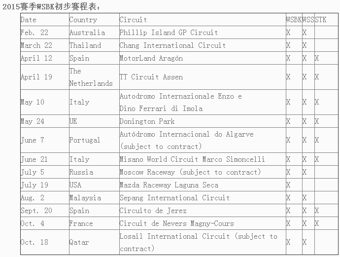 初步的賽程安排顯示,2015年賽季從來年的2月22日澳大利亞Phillip Island GP Circuit站開始,到10月18日卡塔爾Losail International Circuit站結(jié)束。
