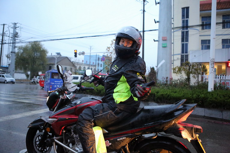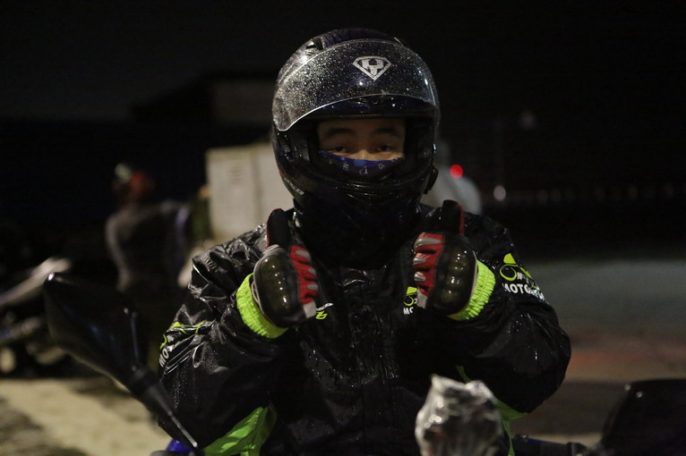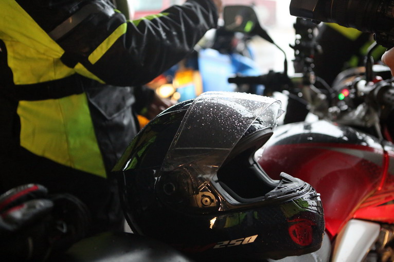 雨滴積在面罩上,加上頭盔的霧氣,遠(yuǎn)方燈光一射,眼都花了。