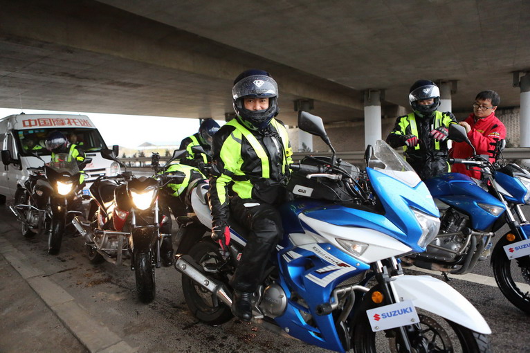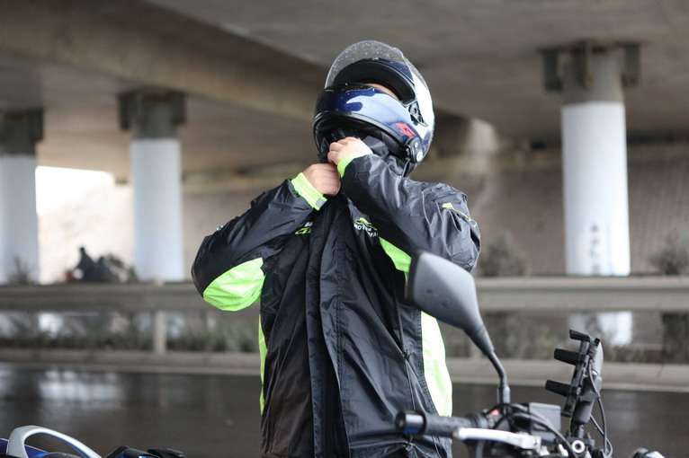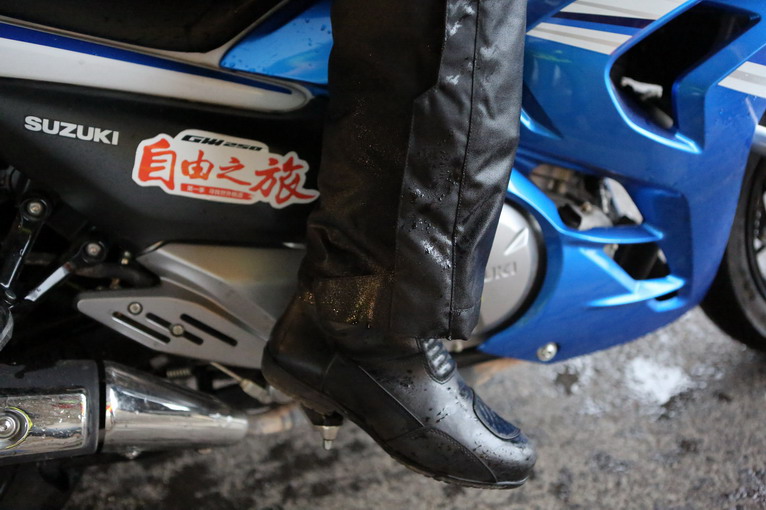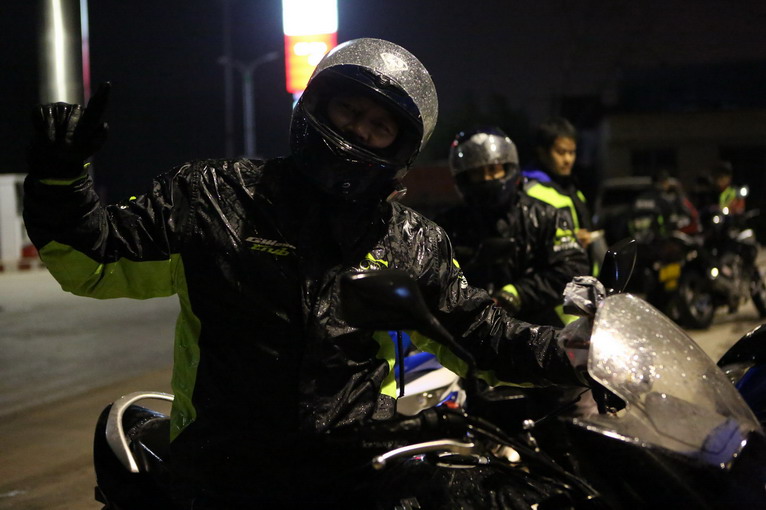 下午,車隊(duì)還沒出臨沂地界,天空下起中雨,眼看繼續(xù)騎行冬季騎行服將被雨水滲透,在國(guó)道上,也難找到擋雨的地方,經(jīng)過幾公里終于在一個(gè)高速橋下躲雨換上雨衣,繼續(xù)上路。