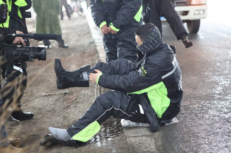冬天穿著厚厚的衣物,穿雨衣也有不少難度,以防萬一,對(duì)防雨淋的電器設(shè)備也做了簡(jiǎn)單的防水處理。