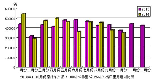 2014年10月份,摩托車產(chǎn)品(100mL<排量≤125mL)出口35.29萬輛,比去年同期下降了6.37%;出口金額1.82億美元,與去年同期下降了3.85%。