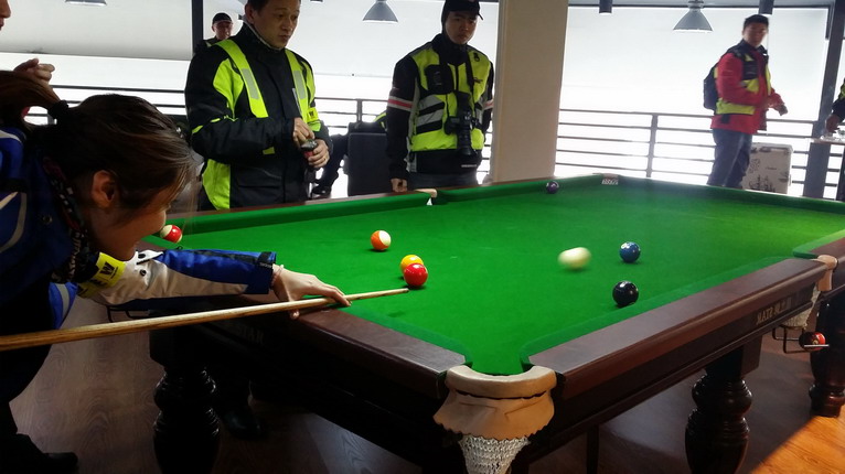 途徑當(dāng)?shù)睾谰舻?,與當(dāng)?shù)剀囉呀涣?,稍作休整。這家店主要服務(wù)摩托玩家,店內(nèi)的裝潢和設(shè)施都玩樂成分十足,小夢和隊員們一到場就要在臺球桌上一試身手。