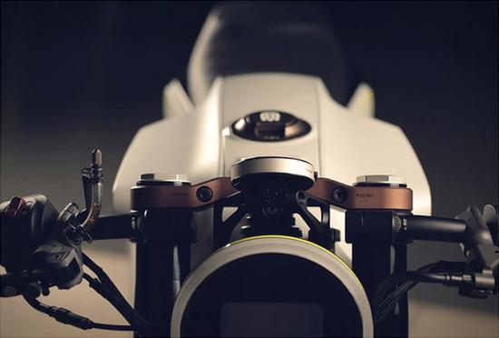401 Vit Pilen 更多的是想展示一個(gè)純粹簡單的公路摩托車, 力求彎道最大間隙、粗壯的三重夾,簡潔的細(xì)節(jié),甚至前大燈都被集成到車架里。
