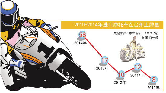 據(jù)市車管所相關(guān)負責人介紹,2010年,只有8輛進口摩托車在臺州上牌;2011年,12輛;2012年,10輛;2013年,17輛;而到了去年,這個數(shù)字躥升至58輛,比2013年增了2倍多。