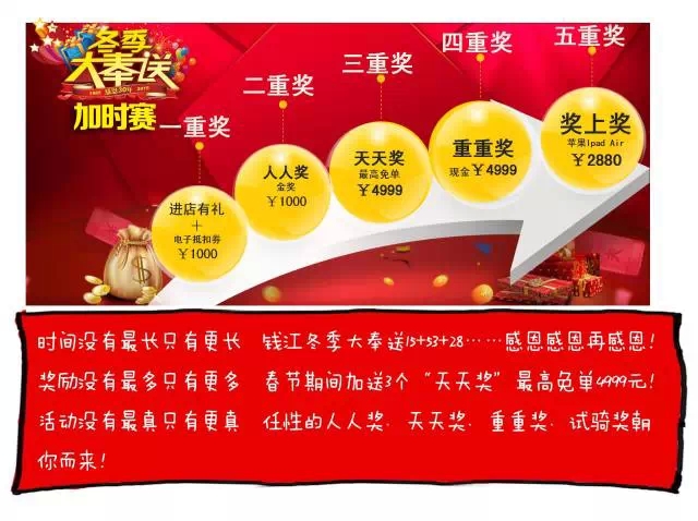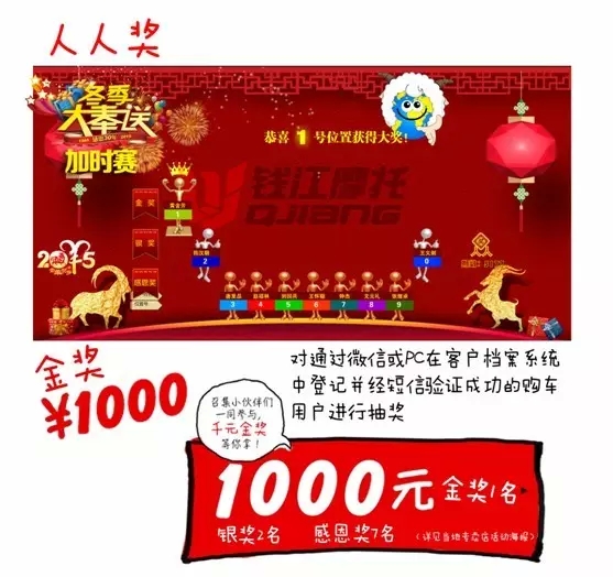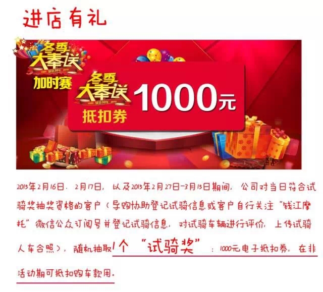 時間沒有最長只有更長 錢江冬季大奉送15+53+28……感恩感恩再感恩! 獎勵沒有最多只有更多 春節(jié)期間加送3個“天天獎”最高免單4999元! 活動沒有最真只有更真 任性的人人獎、天天獎、重重獎、試騎獎朝你而來!