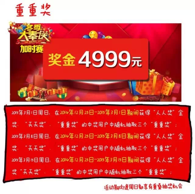 2015年3月15日周日,在2014年12月25日-2015年3月15日期間獲得“人人獎”金獎、“天天獎”、“重重獎”的中獎用戶中隨機(jī)抽取三個“重重獎”。