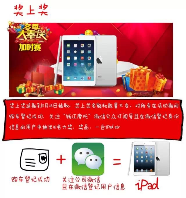 “獎上獎”說明 因連續(xù)的感恩大奉送全國抽獎活動受到商家和消費(fèi)者的大力支持,根據(jù)第二季加時賽活動實際延續(xù)日期,原定獎上獎抽取時間調(diào)整到3月16日抽取并公布,獎勵10部價值2880元蘋果ipad,敬請期待