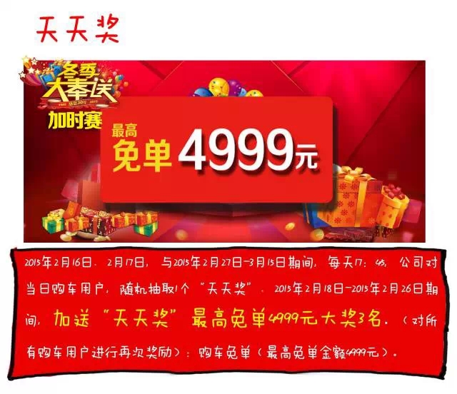 不抽取“天天獎”、“重重獎”和“試騎獎”; 加送:“天天獎”最高免單4999元大獎3名; 2015年2月27日對2015年2月18日-2015年2月26日期間的購車中抽取。