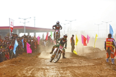 飛躍落地時(shí)一位車(chē)手駕駛的摩托車(chē)傾斜,讓觀眾替他捏了一把汗。