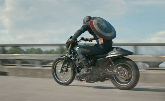 哈雷戴維森這個(gè)老牌,似乎和超級(jí)英雄“科幻”超現(xiàn)實(shí)形象不太接近的廠商近年來(lái)也有大動(dòng)作。先是在《美國(guó)隊(duì)長(zhǎng)1:第一個(gè)復(fù)仇者》中,讓美隊(duì)跨上了WLA軍用摩托車,對(duì)應(yīng)劇情時(shí)間和美隊(duì)的軍人形象,這種組合還是相當(dāng)符合邏輯的,實(shí)際效果也相當(dāng)?shù)撵趴帷?/p>