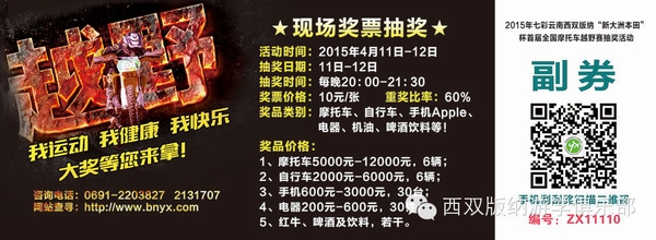 2015年4月10日至12日,“2015年七彩云南西雙版納‘新大洲本田’杯首屆全國(guó)摩托車越野賽”在西雙版納州景洪市龍舟廣場(chǎng)舉辦,本次邀請(qǐng)賽是由西雙版納州政府和景洪市政府主辦,賽事統(tǒng)一由西雙版納州文體局和景洪市文體局負(fù)責(zé),由西雙版納眾享汽摩運(yùn)動(dòng)俱樂部和西雙版納游學(xué)俱樂部承辦。驚險(xiǎn)、刺激、壯觀的場(chǎng)面將是潑水節(jié)活動(dòng)新的亮點(diǎn),也是你一生不容錯(cuò)失的一次視覺盛宴。