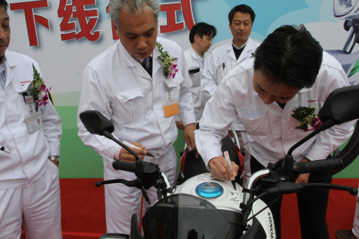 摩托車研究開發(fā)有限公司總經(jīng)理戶坂哲也及矢野謙吾、比留間忠夫、高見規(guī)丈等相關(guān)領(lǐng)導(dǎo)及新大洲本田公司總經(jīng)理小林太郎、副總經(jīng)理下川一郎及各單位領(lǐng)導(dǎo)、項(xiàng)目組成員等100多人參加了下線儀式。