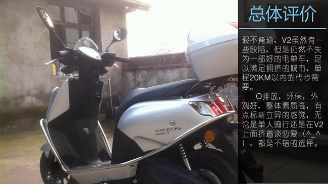 瑕不掩瑜,V2雖然有一些缺陷,但是仍然不失為一部好的電單車,足于滿足擁擠的城市,單程20KM以內(nèi)的代步需要。0排放,環(huán)保,外觀好,整體素質(zhì)高,有點(diǎn)標(biāo)新立異的感覺,無論是單人騎行還是在V2上面擠著談戀愛,都是不錯的答案。