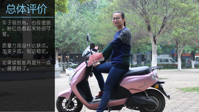 很多人覺得V2儲物箱小,胡小姐個人認(rèn)為還好。以前用過的電動車也差不多體積,但儲物箱的空間更小。V2粉紅色看起來特別可愛;質(zhì)量方面沒什么缺點(diǎn);加速平順,制動穩(wěn)定,就是續(xù)航方面再提升一點(diǎn),就更好了。