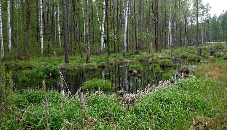 經(jīng)過一片白樺林旁,看到許多水潭,看起來很有FEEL。