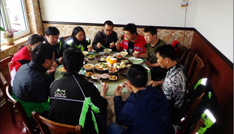 5月17日一大早,昨天接我們的吉林車友們6點(diǎn)鐘就在樓下等我們了,吉林車友(飆風(fēng)摩旅俱樂部)帶我們?nèi)チ艘患以绮宛^,這是我們這20多天來吃過最豐盛的早餐了!