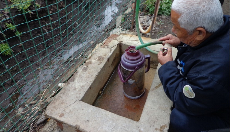 藥水泉,經(jīng)過專業(yè)人士深入考察和考證后,得到結(jié)論能輔助治療各種慢性胃炎等療效。隊(duì)員們嘗了幾口藥水泉,有很多種金屬的味道,有點(diǎn)像蘇打水,可是味道更重一些,可能會有些人喝不習(xí)慣。原來的藥水泉眼被當(dāng)?shù)厝朔馄饋砹?,因?yàn)樗幩淮虺鰜砗?,放久了會失去藥效。所以只用了軟水管引到家里,直接用熱水壺裝起來。