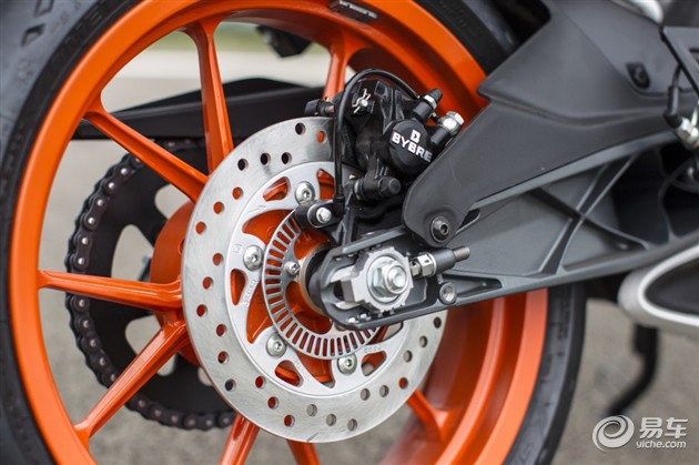 制動是這輛車唯一令人感覺溫和的地方,出自brembo的入門級剎車系統(tǒng)手感相當線性。前四活塞配300mm剎車碟剛剛適合這輛輕盈的跑車。用雙碟剎的話確實有點浪費(那樣的話這車的制動就和它的動力輸出一樣顛狂了),但這里有點遺憾,前剎車碟沒有采用浮動碟,所以連續(xù)高強度跑了十來圈之后制動衰減有點明顯。KTM原廠提供了菊花式浮動式剎車碟可改裝或選裝,但碟片尺寸沒變;既然都改剎車碟了為什么不加大一級到320mm呢?