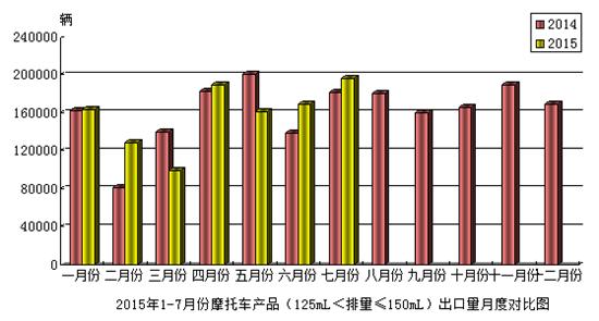 2015年7月份摩托車產(chǎn)品(125mL<排量≤150mL)出口19.61萬輛,比去年同期增長了8.27%;出口金額1.07億美元,比去年同期增長了2.46%。