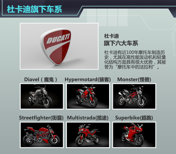 杜卡迪現(xiàn)在的車系包括有Diavel魔鬼,是美式巡航車;Hypermotard 駭客,是滑胎車,也能算是街車;Monster怪獸,是標準的街車;Streetfighter街霸,也是街車;Multistrada攬途,是全地形車加巡航跑車;Superbike超跑,是標準的跑車。街車和跑車的區(qū)別,跑車的發(fā)動機馬力更大,高轉表現(xiàn)更好,重量也更輕,配置也高,前傾角也小,整個車被導流罩包裹。杜卡迪是世界頂尖的摩托車制造商,他在國內最便宜的車型是Monster795,價格是11.9萬,發(fā)動機87馬力,車重161公斤。