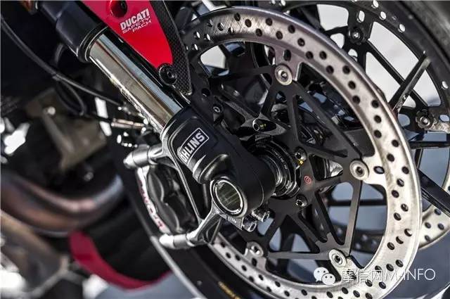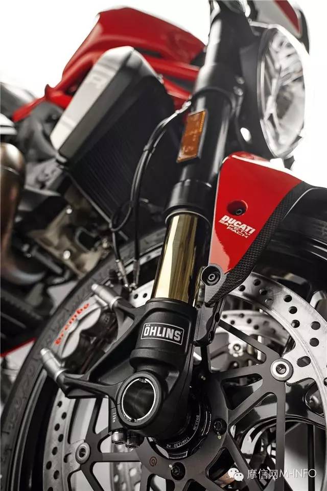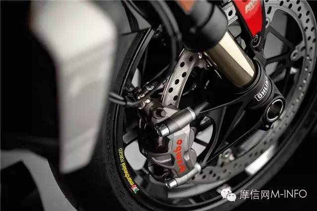 新的Marchesini鋁壓鑄輪轂在輕量化的同時,還保持相同的重量,搭配Panigale同款的Pirellis超大的200系列后胎,保證完美抓地。剎車系統(tǒng)同樣是采用超規(guī)格賽車風格的Brembo M50卡鉗配合330mm剎車盤來保證安全。