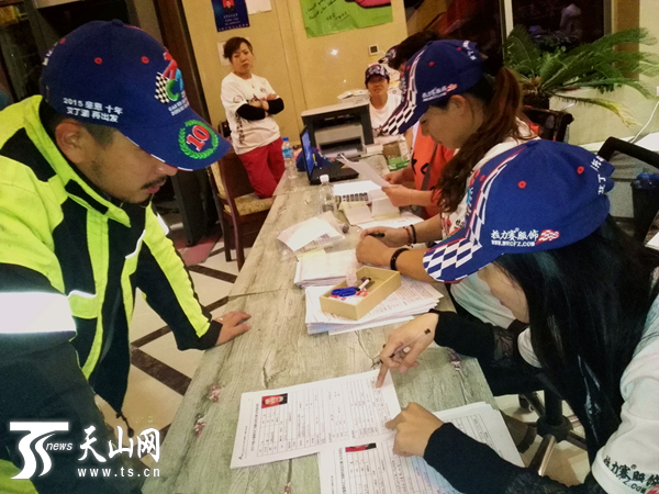核心提示:車手正在辦理報到手續(xù)。天山網(wǎng)訊(記者王瑋攝影報道)10月15日晚間21時,夜幕已經(jīng)完全籠罩吐魯番市,但在2015中國吐魯番第十屆環(huán)