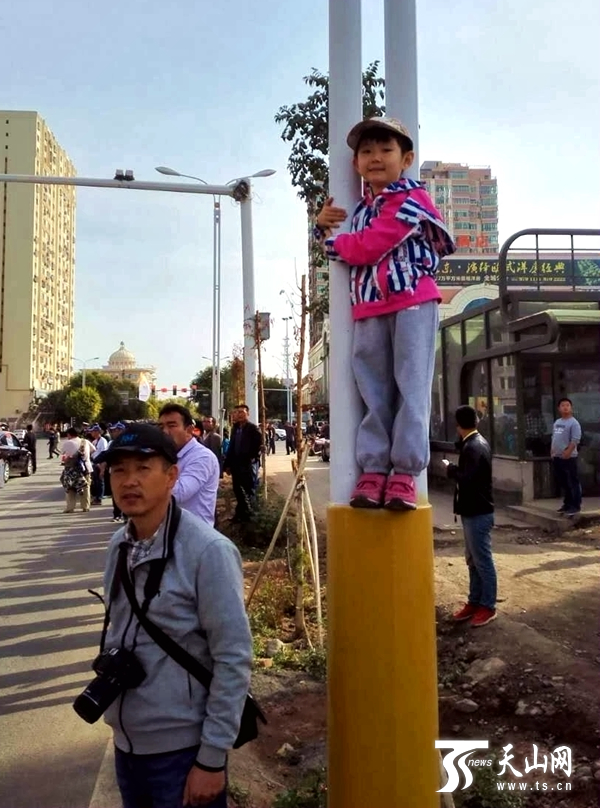 為了能讓年幼的女兒看的清楚,馬東疆把她抱上齊胸高的路燈桿基座,小家伙抱著路燈桿,沒有害怕的表情,臉上倒是一副對即將開始的比賽的好奇。