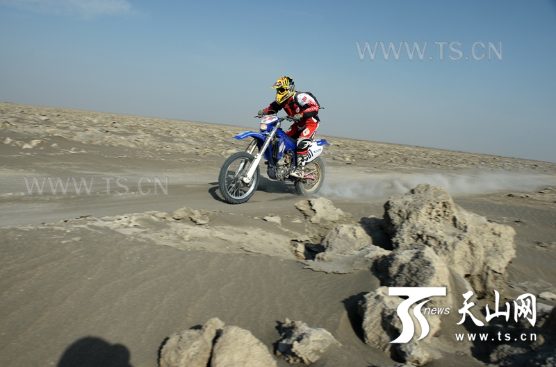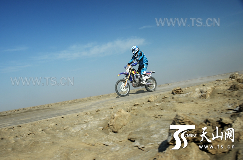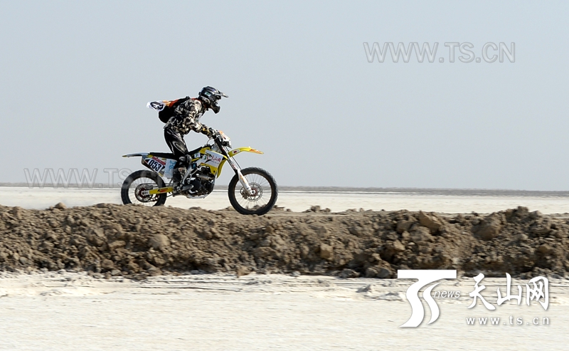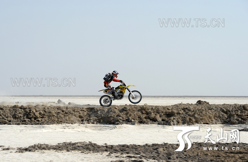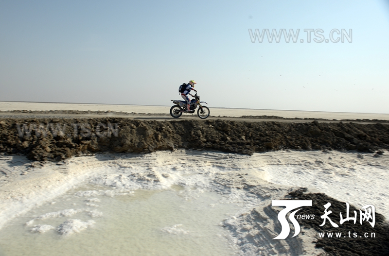 車(chē)手在比賽中經(jīng)過(guò)布滿(mǎn)鹽堿的艾丁湖區(qū)。